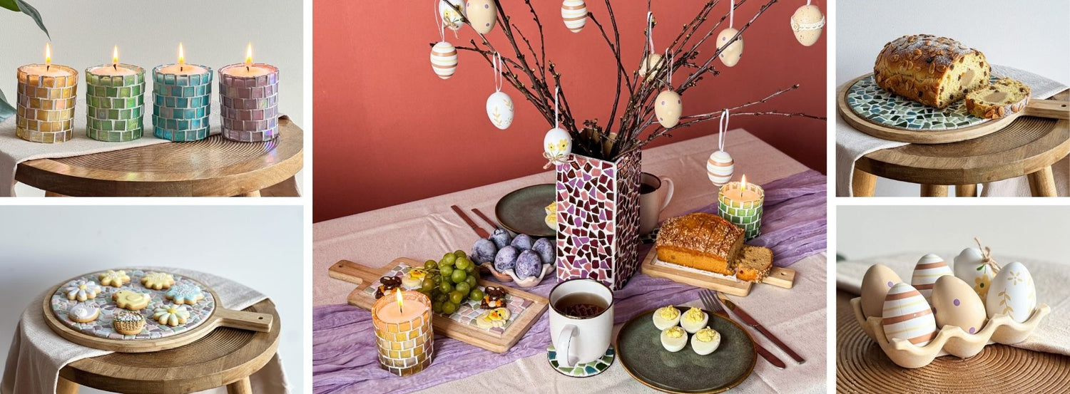 Our collection includes stunning pieces for your easter table decorations. A mosaic vase filled with decorative branches, a modern egg holder for boiled eggs, or a handcrafted bowl that stands out effortlessly on the table.