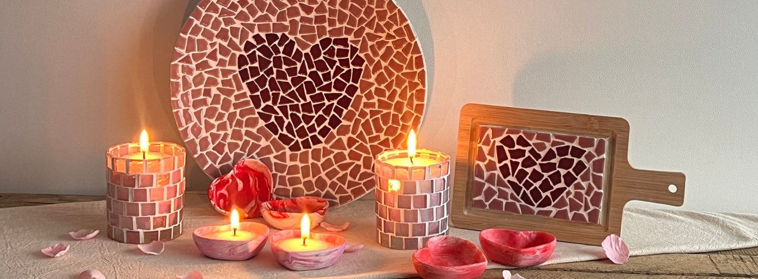 Deze collectie is perfect voor wie op zoek is naar een origineel valentijncadeau dat verder gaat dan bloemen of chocolade. Denk aan mozaïek borrelplanken, romantische kaarsenzand-kleuren in rood en roze en een speciaal giethars hartjes schaaltje. Elk product is ontworpen als een limited edition, speciaal voor Valentijn.