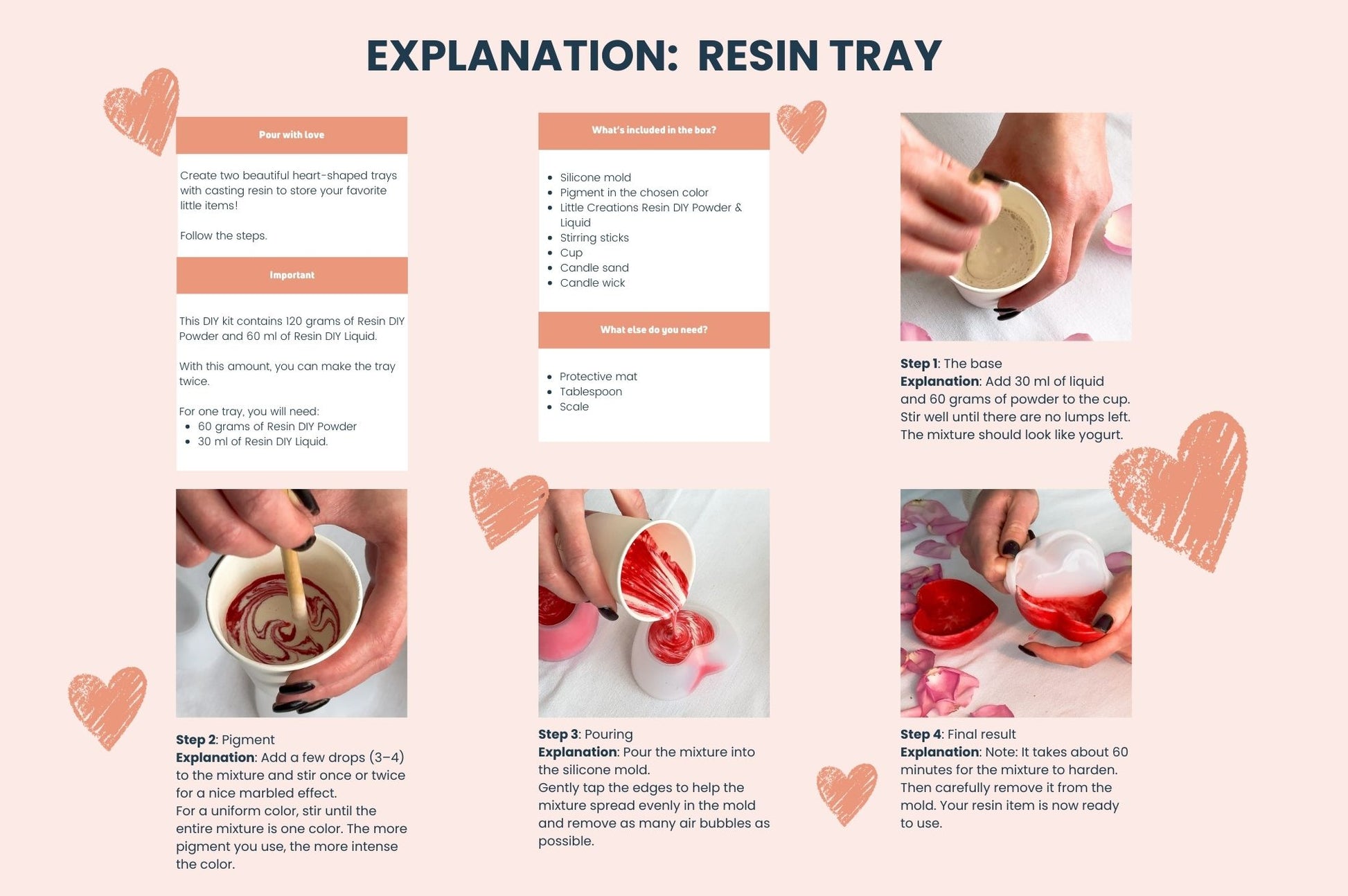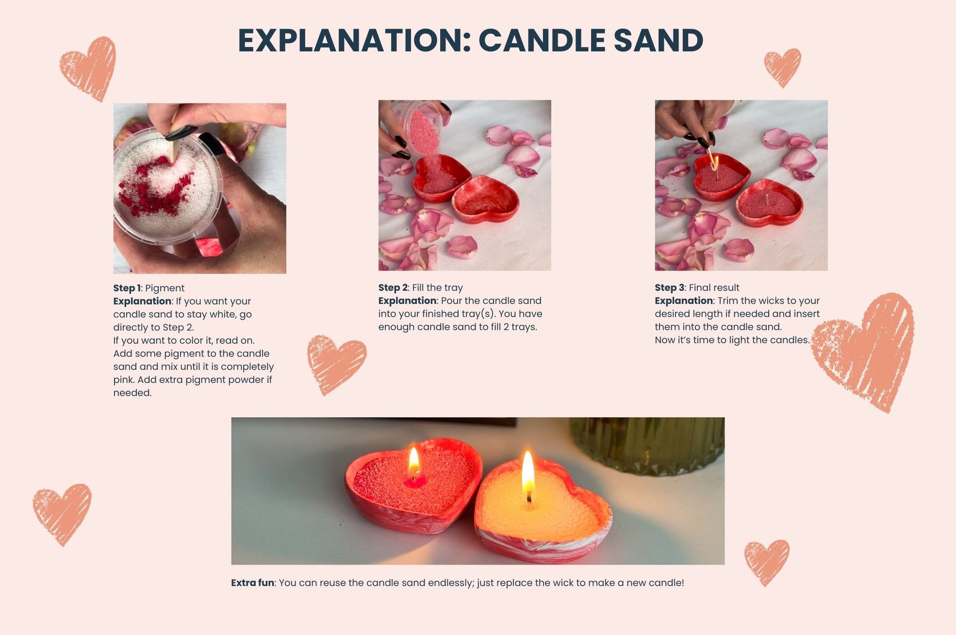 Na het uitharden vul je het hartjes schaaltje met het meegeleverde kaarsenzand en plaats je een lontje. Zo maak je eenvoudig een leuk kaarsje. Zodra het lontje is opgebrand, vervang je het lontje en gebruik je het kaarsenzand opnieuw.