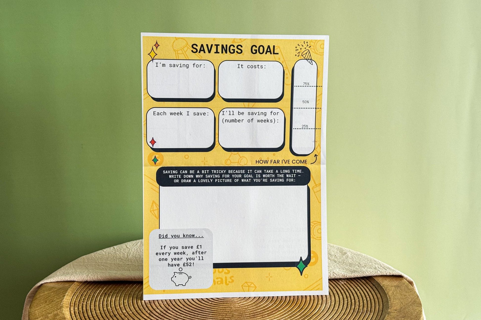 Bij dit knutselpakket zit een A4 spaardoel-pagina waarop kinderen hun spaardoel kunnen invullen. Ze schrijven op waar ze voor sparen, wat het kost, hoeveel ze per week sparen en hoeveel ze al bij elkaar hebben. (Dit A4'tje zit er ook in het Nederlands bij).