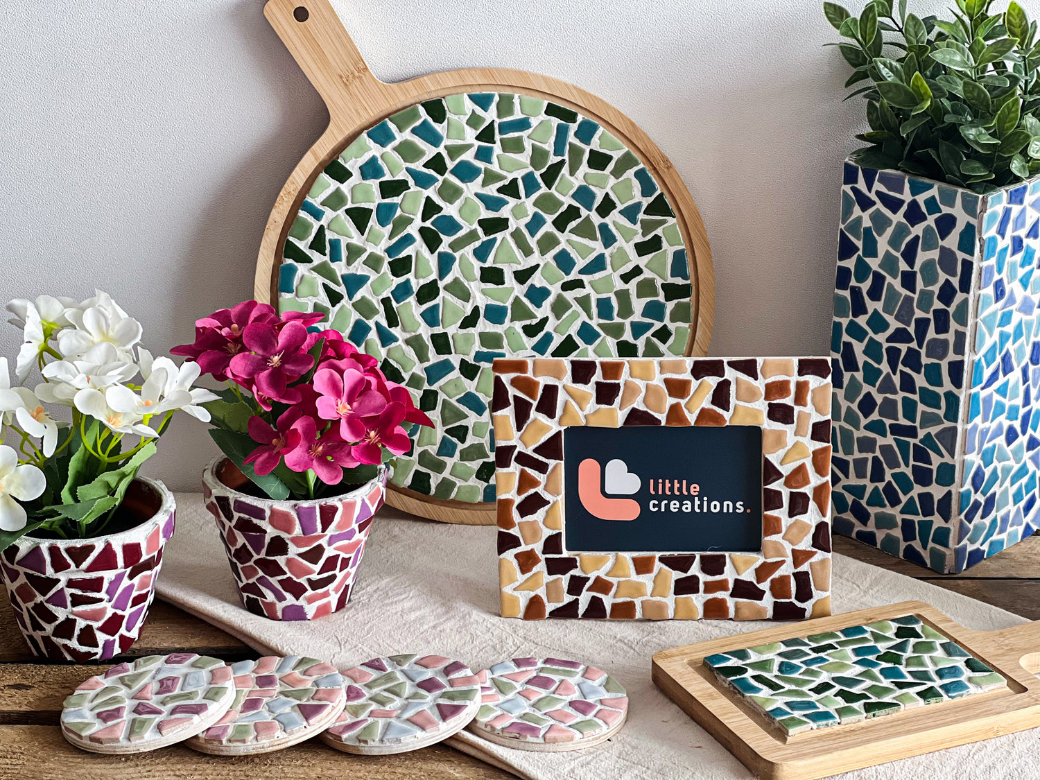 At Little Creations, quality always comes first. That’s why we carefully select FSC-certified bamboo for our boards and use scratch-resistant, rounded mosaic tiles with a glossy glazed finish. The result? Not only a fun and creative time together, but also a beautiful handmade piece you can be truly proud of.