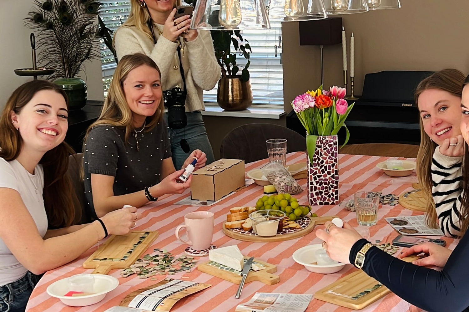 ''Vandaag met 5 vriendinnen de mozaïek borrelplank gemaakt! Ontzettend leuk! En ideaal, alles zit erbij, je hoeft zelf niks aan te schaffen. Ruime hoeveelheid steentjes. Had zelf de groene variant, zat ook een kleur bij die meer naar blauw neigt, past iets minder bij mijn kleurpalet, maar er was genoeg om die kleur eruit te houden! Ze zijn bij iedereen echt leuk geworden. 😊 Ondertussen allemaal lekkers op tafel en je hebt een heerlijk vriendinnendagje!''
