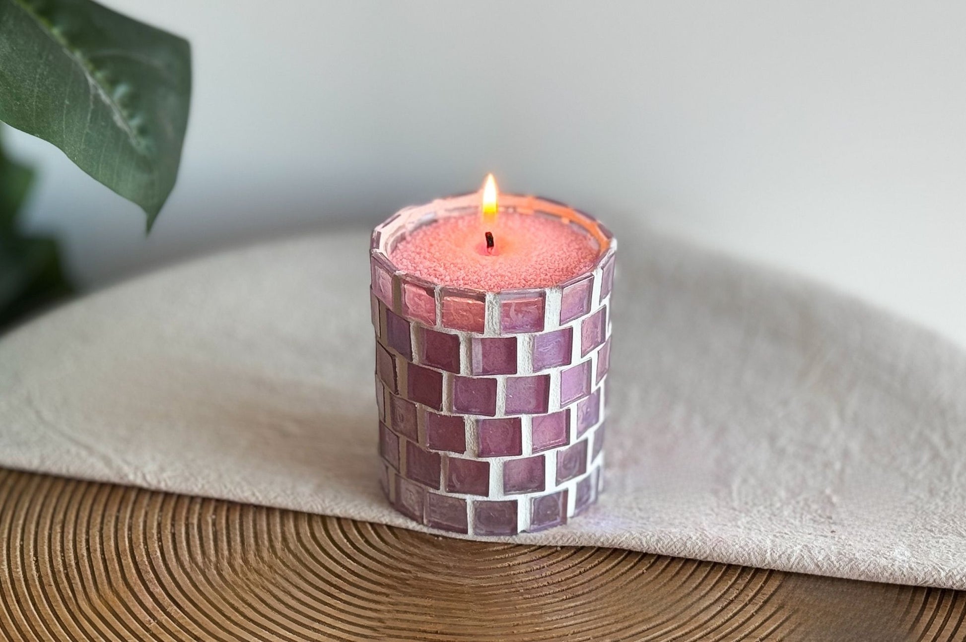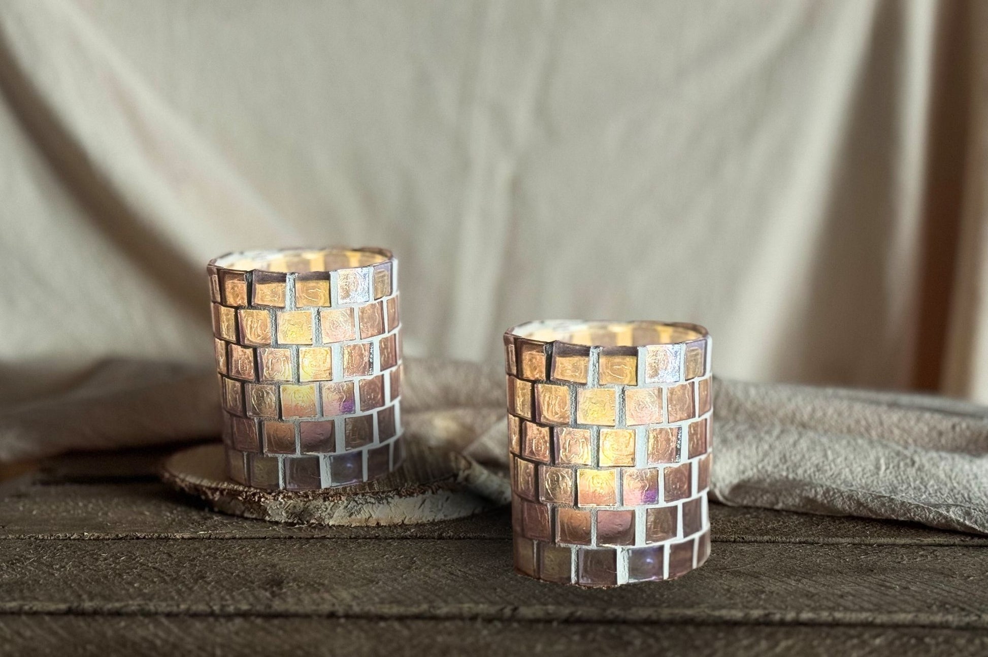 Create two glass mosaic tealight holders and fill them with candle sand for a warm and unique candlelight effect.